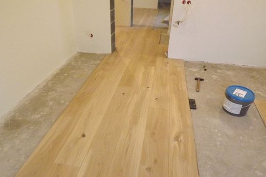 Arī šoreiz mūsu klients vēlējās savā privātmājā grīdu no maksimāli platiem ozolkoka dēļiem. Te gan uzreiz jāpiebilst, ka mājas abos stāvos pamatgrīda bija no betona un pirmajā stāvā vēl papildus grīdas apsilde. Šādos gadījumos mēs masīvkoka grīdas kategoriski neiesakam un noteikti paši to montāžu neuzņemsimies (mēs zinam, ka ir citi meistari, kas to dara un saka, ka šādām grīdām nav ne vainas).