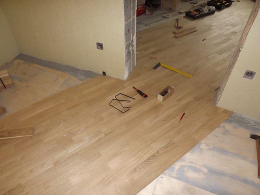 Atgriežoties pie konkrētā objekta, mūsu klients izvēlējās ozolu "natur" 70x420mm. Ieklāšanas virziens tika ņemts pēc virtuves daļas (konkrētajā objektā virtuve bija apvienota ar viesistabu) un tāds tas arī palika visās telpās, jo parkets tika ieklāts vienlaidus bez savienojumiem durvju ailēs. Grīdas pamatne - 22mm biezs finieris, kurš gan iepriekš bija nokrāsots ar krāsu, tāpēc pirms parketa ieklāšanas to nācās pārslīpēt.